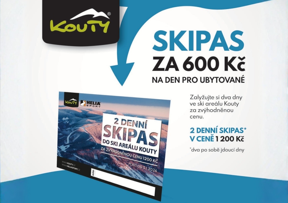Ubytujte se u nás a lyžujte výhodně v Ski areálu Kouty. Pro naše ubytované hosty je připraven zvýhodněný dvoudenní skipas za 1 200 Kč, platný od 5. 1. 2026 do konce zimní sezóny. Využijte skvělou cenu a užijte si dva dny na svahu.